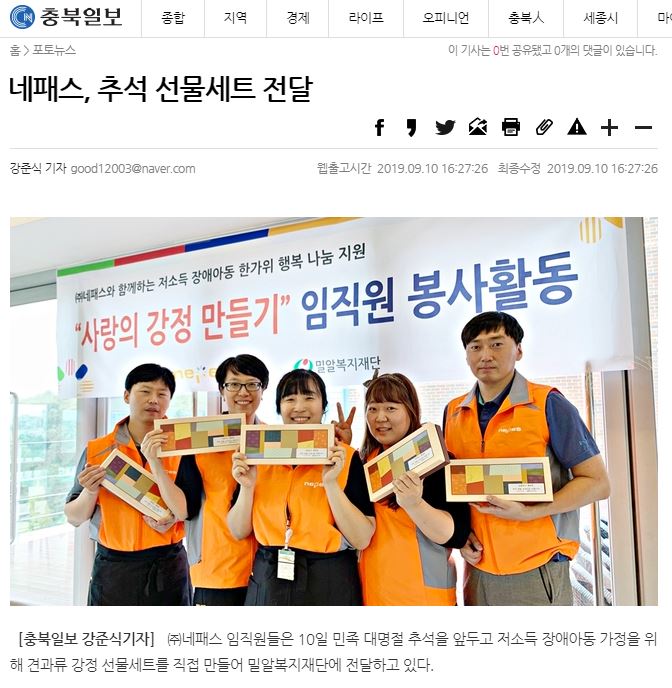[충북일보] 네패스, 밀알복지재단에 추석 선물세트 전달