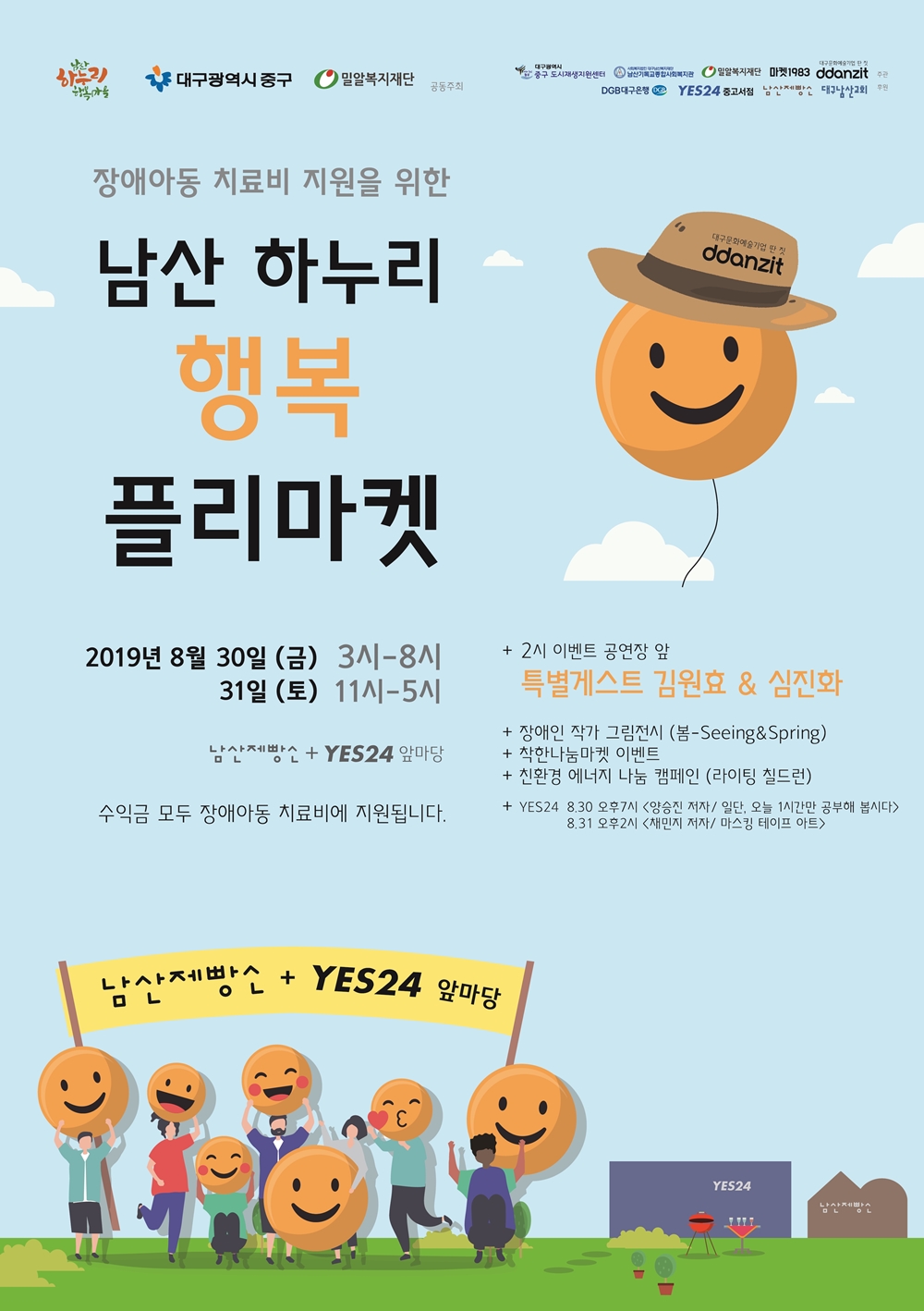 밀알복지재단 대구경북지부(지부장 김신희)와 대구광역시 중구청(구청장 류규하)이 오는 30~31일 양일 간 대구광역시 중구 남산2동 남산제빵소와 YES24중고서점 앞 광장에서 ‘남산 하누리 행복 플리마켓’을 개최한다.