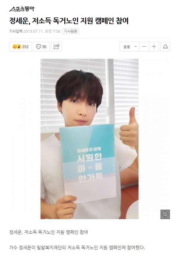 [한국경제] '프로듀스101 출신' 가수 정세운, 저소득 독거노인 지원 캠페인 동참