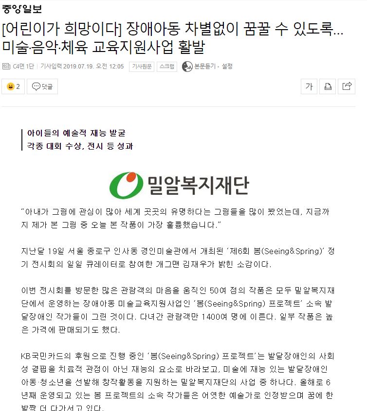 [중앙일보] [어린이가 희망이다] 장애아동 차별없이 꿈꿀 수 있도록…미술·음악·체육 교육지원사업 활발