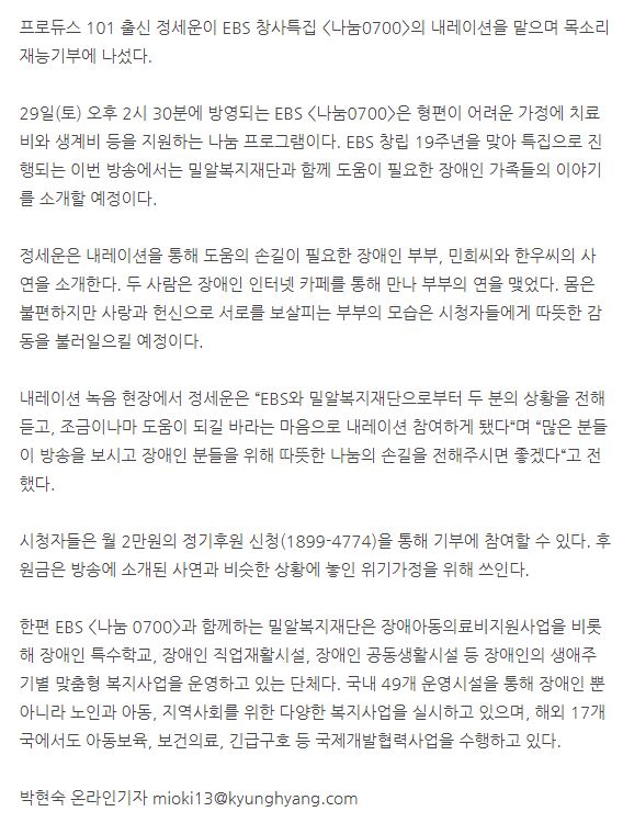 [헤럴드경제] 정세운, EBS '나눔0700' 내레이터 참여