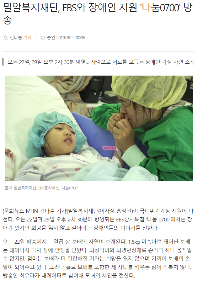 [문화뉴스] 밀알복지재단, EBS와 장애인 지원 '나눔0700' 방송