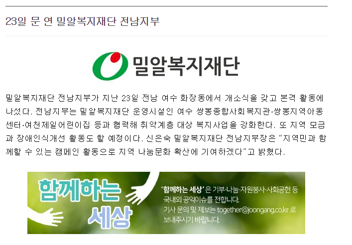 [중앙일보] [NPO브리핑] 밀알복지재단 전남지부 개소