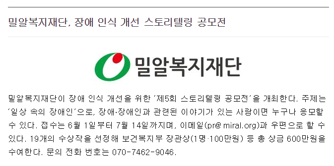 [중앙일보] [NPO브리핑] 밀알복지재단, 스토리텔링 공모전 개최