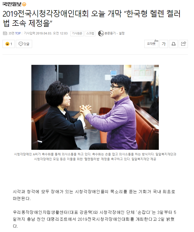 [국민일보] 2019전국시청각장애인대회 오늘 개막 “한국형 헬렌 켈러법 조속 제정을”