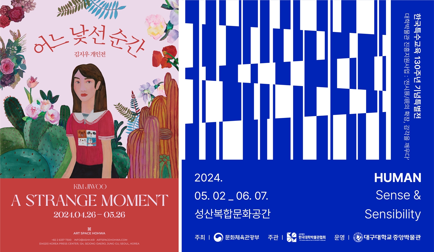 (왼쪽부터) 김지우 작가의 '어느 낯선 순간', 김기정 작가의 'HUMAN_sense&sensibility' 전시회 포스터