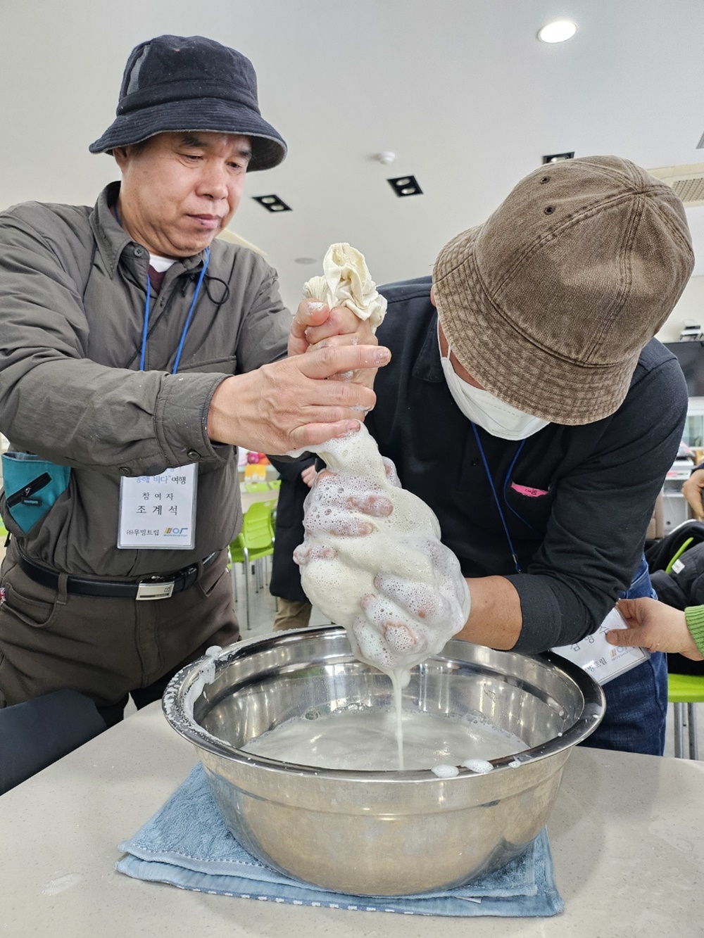 [사진2] 15일 강릉초당두부마을에서 시청각장애인 조계석 씨가 도움을 받아 두부 만들기 체험을 하고 있다.