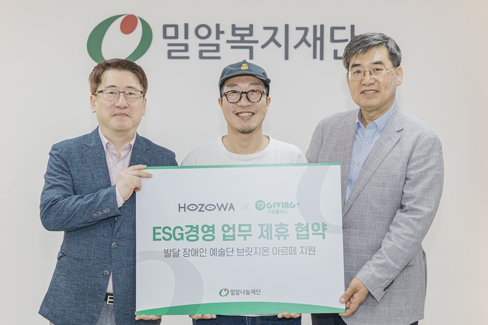 [사진1] (왼쪽부터) HOZOWA 신종훈 대표이사, 호조 작가, 밀알나눔재단 김인종 기빙플러스 본부장