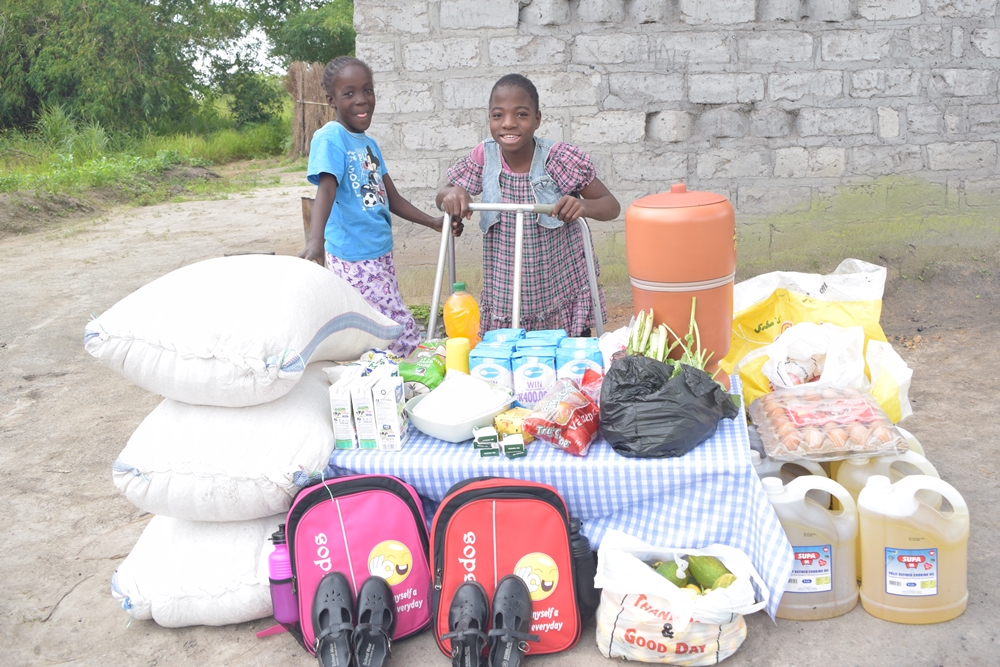 [사진3] 지원물품 앞에서 밝은 미소를 띠고 감사인사를 전하는 에스더(왼쪽)와 러브니스(오른쪽)