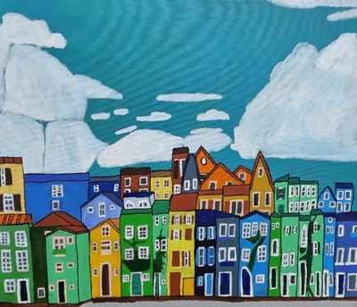 김성찬, 에메랄드 빛 하늘의 마을, acrylic, marker on canvas, 2022 |