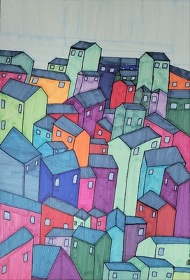 윤인성, 파란지붕의 집, marker on paper, 2022 |