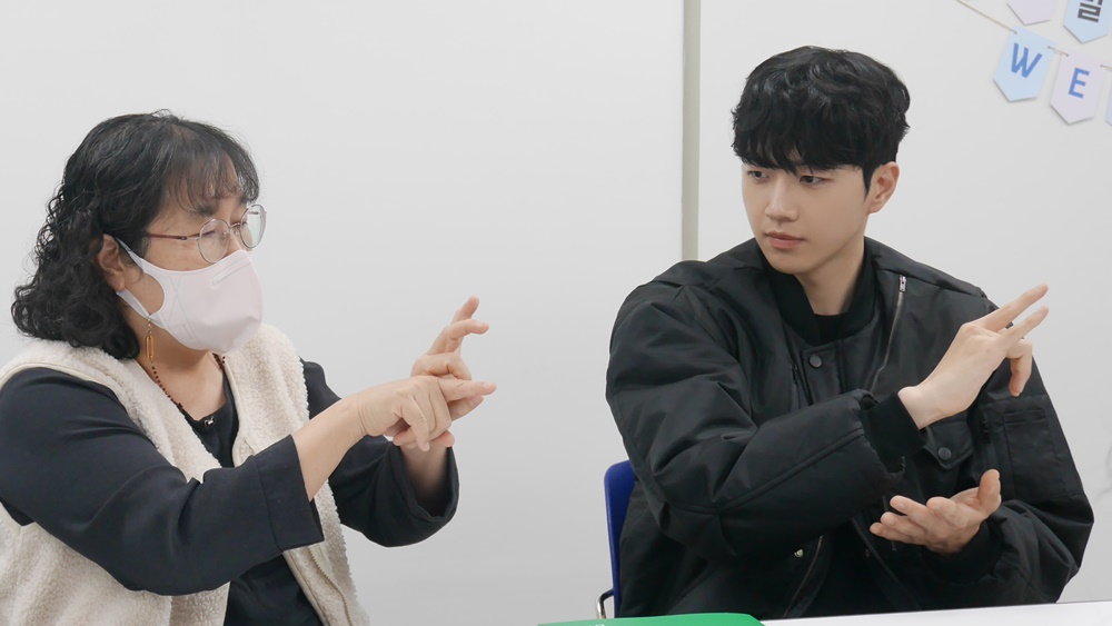 [사진2(좌)] 배우 강훈이 수어톡톡 캠페인에 앞서 수어통역사(왼쪽)로부터 ‘만나다’를 표현하는 수어를 배우고 있다.