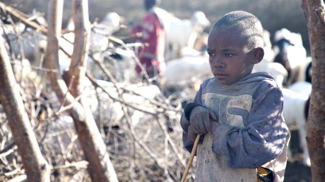[사진1] 학교 대신 이웃집 가축을 돌보는 일을 하는 리샨(9, 가명). 가뭄으로 가축마저 죽어가면서 생계를 이어가기 어려운 상황에 놓여 있다.