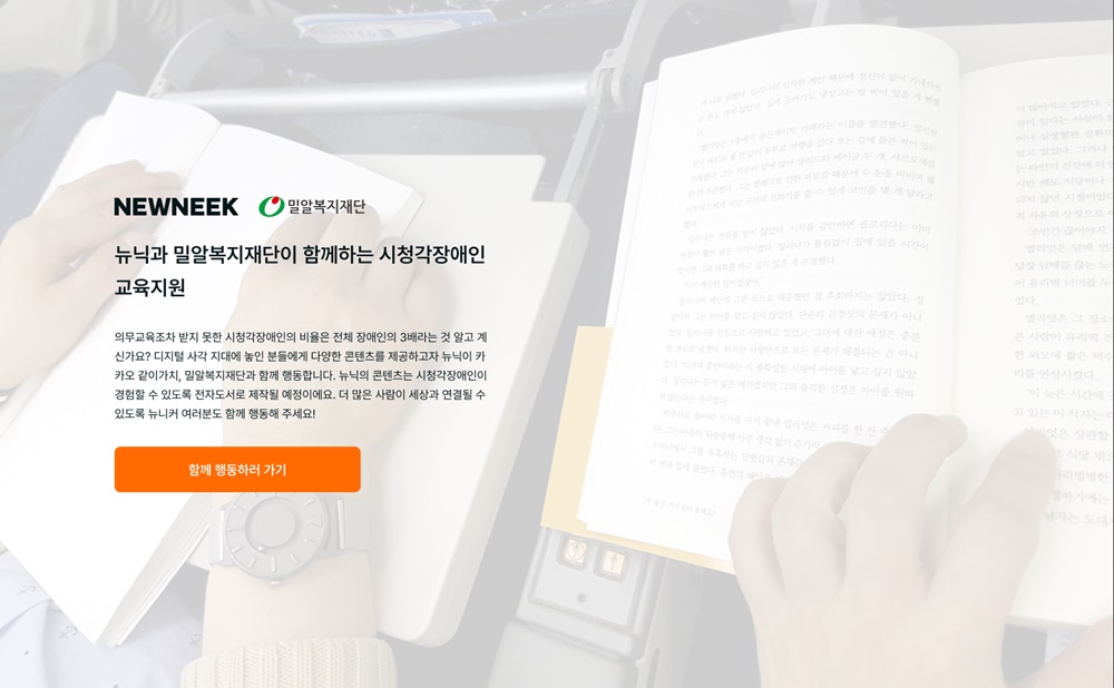 뉴닉은 전자도서 기부와 동시에 밀알복지재단과 함께하는 온라인 캠페인 ‘모두와 함께, 뉴닉’을 실시한다. 본 캠페인은 모든 사용자가 특정 환경이나 신체적 특징에 상관없이 디지털 환경에서 제공하는 정보에 불편함 없이 접근할 수 있도록 제작한 웹 페이지로, 캠페인을 통해 ‘정보 접근성’에 대해 알린다.