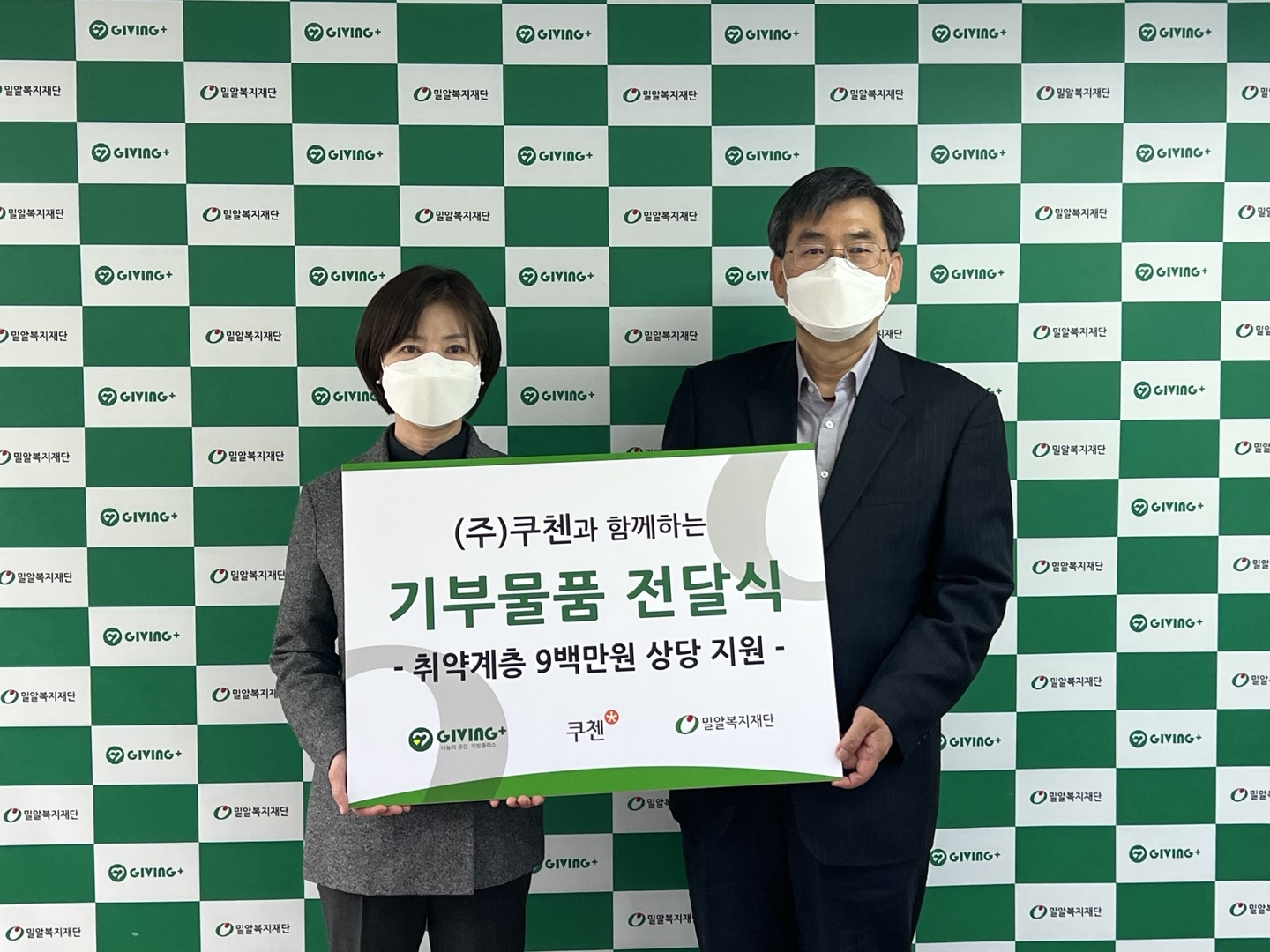 (왼쪽부터)서은영 쿠첸 마케팅본부 상무와 김인종 밀알복지재단 기빙플러스 본부장이 기부물품 전달식 뒤 기념 촬영을 하고 있다.