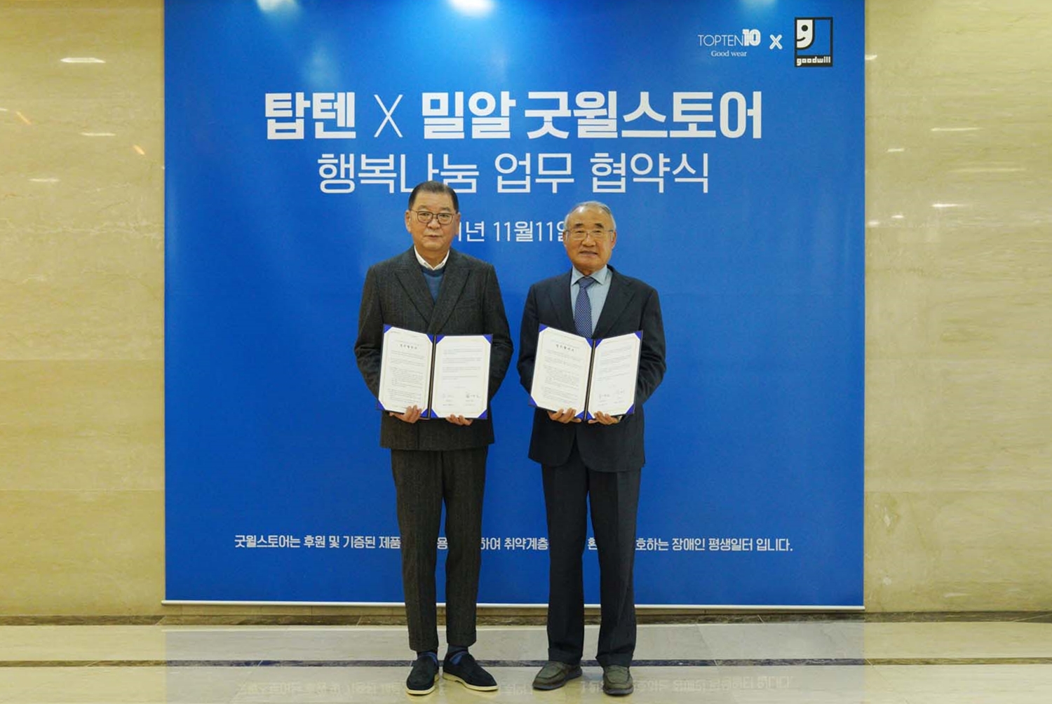 밀알복지재단(이사장 홍정길)이 운영하는 장애인 일터 굿윌스토어와 토종 SPA 브랜드 탑텐(TOPTEN10)을 전개하는 신성통상(회장 염태순)은 11일(목) 사회공헌 업무협약(MOU)을 맺고 장애인 일자리 창출과 환경보호를 위한 ‘행복나눔 캠페인’을 공동 진행한다고 밝혔다.