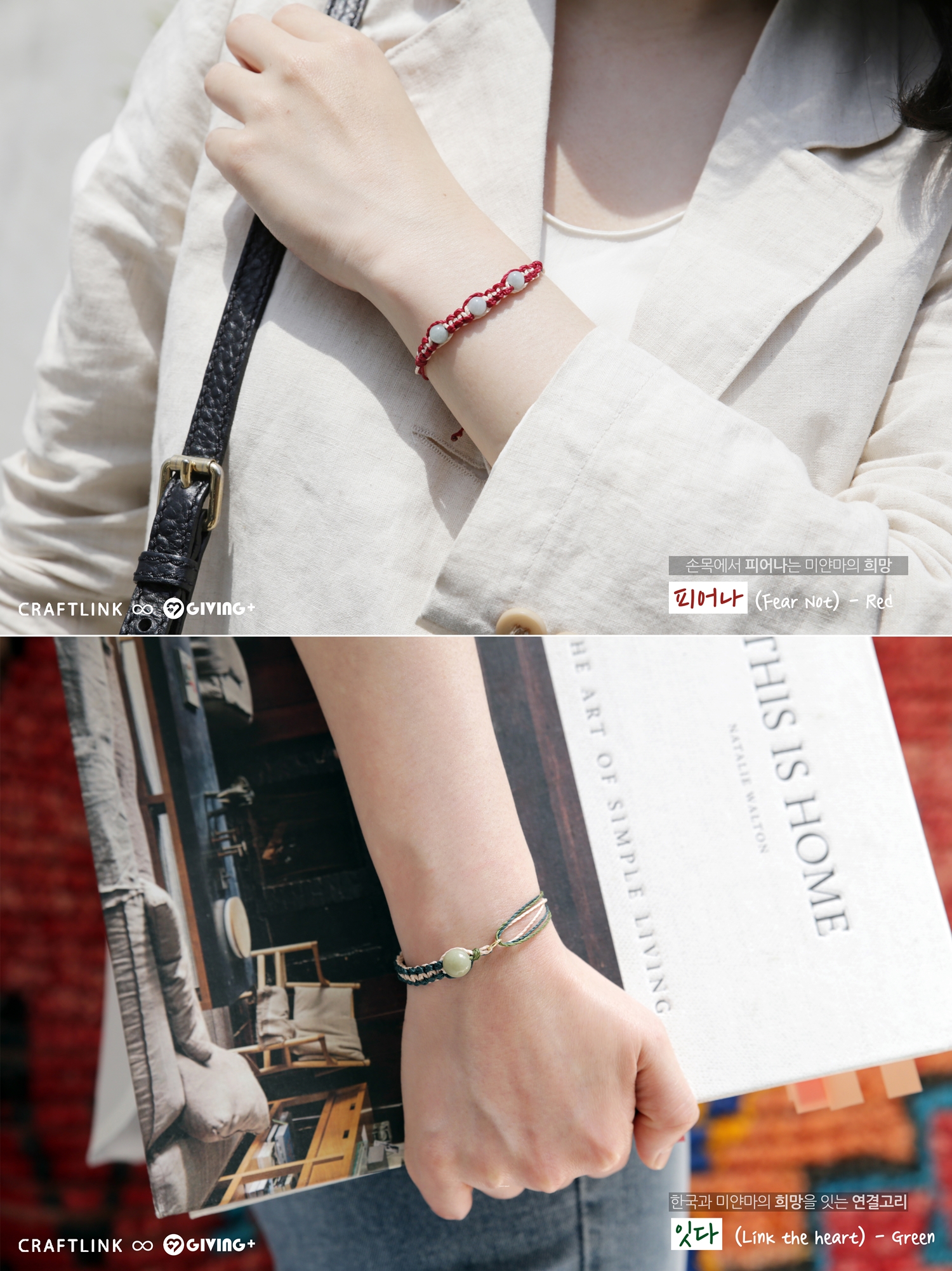 ‘잇다’ 팔찌는 미얀마 국기를 연상시키는 3색을 조화롭게 사용한 팔찌로, 금색 링으로 실과 옥구슬을 잇는 디자인을 통해 한국과 미얀마를 잇는 연결고리를 표현했다. ‘피어나’ 팔찌는 최근 미얀마에 희망이 피어나길 바라는 마음과 세상에 있는 모든 폭력과 공포가 없는(Fear Not) 세상이라는 뜻을 담은 팔찌다. 미얀마 시민 운동의 상징으로 떠오른 ‘세 손가락 경례’에 영감을 받아 연옥 3개를 평매듭 방법으로 엮어 제작했다.