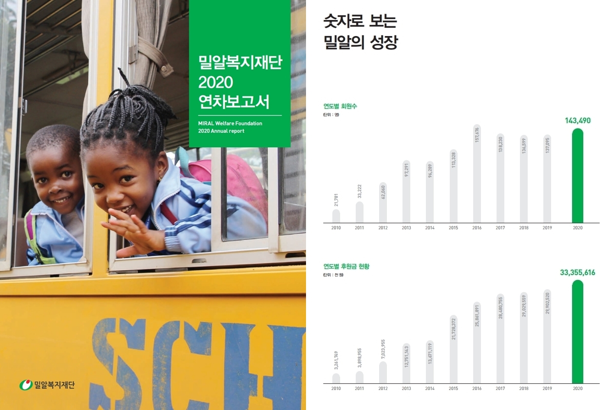 보고서에 따르면 2020년도 밀알복지재단의 후원금은 333억여 원으로 전년도에 비해 11% 이상 증가한 것으로 나타났다. 신규 후원자는 14만3400여 명으로 6300여 명 상승했다. 코로나19로 모두가 힘든 한 해를 보냈지만 더 어려운 이웃을 도우려는 시민들의 온정은 이어진 것이다. 이 같은 후원자들의 성원으로 밀알복지재단은 지난 한 해 국내외 27만여 명을 지원했다.