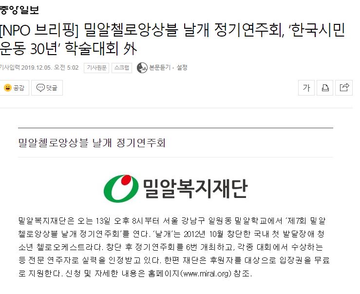[중앙일보] [NPO 브리핑] 밀알첼로앙상블 날개 정기연주회, ‘한국시민운동 30년’ 학술대회 外