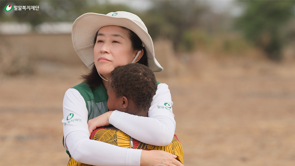 탄자니아에서 만난 아동 아미나를 안아주는 배우 김미경
