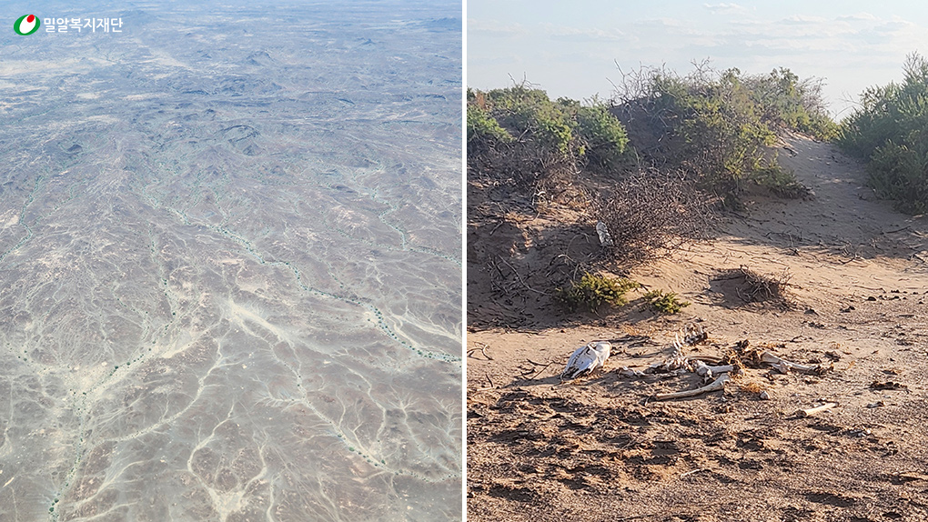 (좌)하늘에서 바라본 케냐 마사빗 / (우)마사빗 곳곳에서 폐사된 가축의 사체
