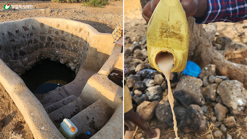 (좌)가뭄으로 말라버린 우물 / (우)끼니 대신 먹는 우유를 탄 물