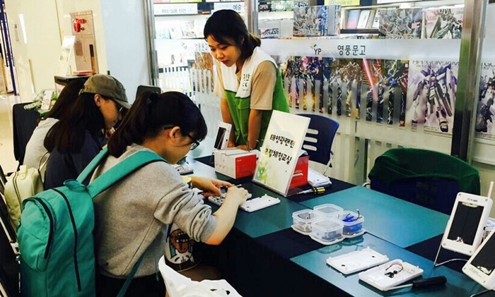 태양광랜턴을 조립하는 학생들 모습