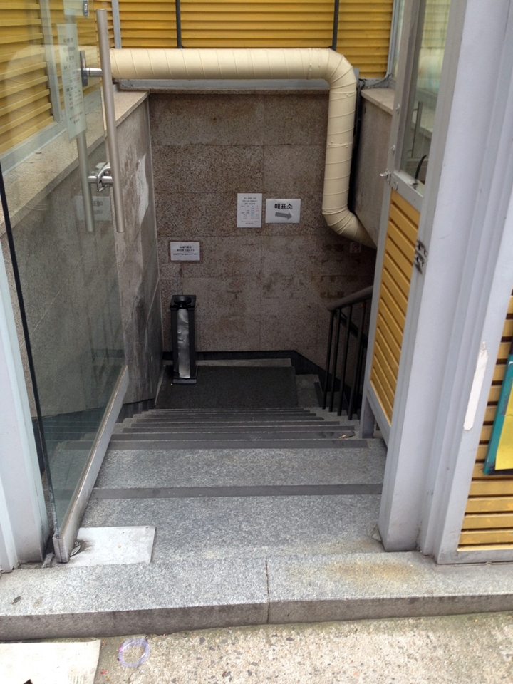 엘리베이터가 있는 건물이지만 매표소는 엘리베이터가 없는 지하에 있어 이용이 불편한 모습(우)
