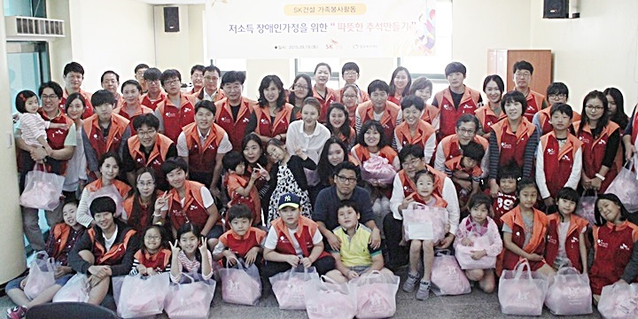 우리나라 대명절인 추석을 맞이하여 경제적인 어려움이 있거나 가족이 없는 소외된 이웃들이 조금이나마 따뜻한 추석을 보낼 수 있도록 SK건설 가족봉사단 80여명이 함께 하였습니다. 이 날 만들어진 음식은 사회적 기업 떡찌니와 함께 준비하였으며, 송편, 인절미 등 떡과 함께 식혜 등을 저소득 장애인 가정 100가정에게 전달하였습니다.