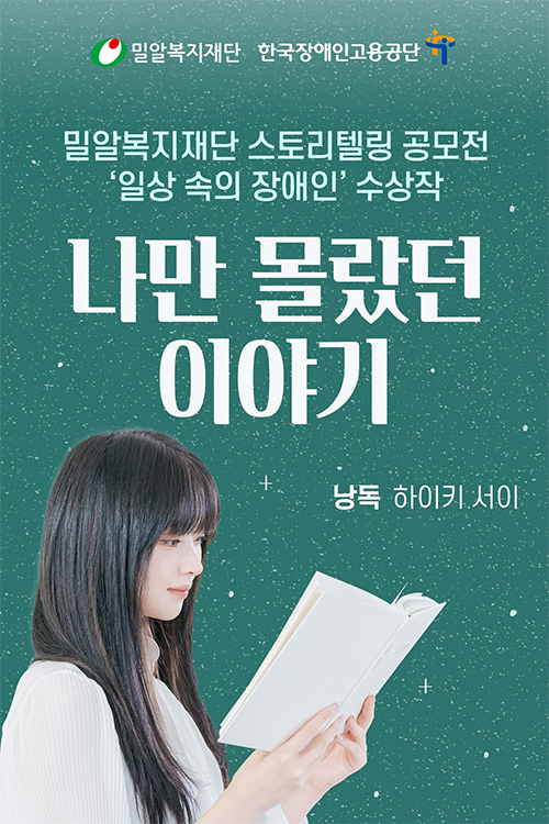 쌀쌀해지는 11월을 따스하게 감싸줄, 오디오북 「나만 몰랐던 이야기 8」이 여러분의 곁으로 찾아갑니다. 「나만 몰랐던 이야기」는 밀알복지재단과 한국장애인고용공단이 함께하는 스토리텔링 공모전 수상작으로 제작되며, 지금까지 정소민, 김인권, 박시은, 진태현, 윤현민 등의 배우들과 여러 성우가 낭독자로 참여했습니다. 그들의 선행에 이어 이번에는 노래 ‘건물 사이에 피어난 장미’로 많은 이들에게 감동을 선사한 그룹 하이키의 리더 서이가 오디오북 녹음에 함께했습니다. 차분하면서도 귀를 사로잡는 매력적인 목소리로 낭독하여 수상작들의 아름다운 스토리를 더욱 생동감 있게 전해주었습니다.