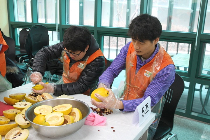 호반건설 임직원들은 광주지역에 거주하는 독거어르신들의 환절기 예방을 위해 정성어린 손짓으로 어르신들이 드실 모과차를 만들습니다. 모과차를 만든 후에는 각종 생필품을 비롯하여 진심을 담은 편지를 작성한 후 포장하는 시간을 가졌습니다.