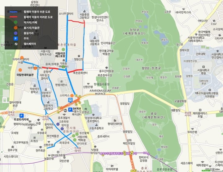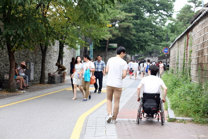 북촌 한옥마을과 계동길 만약 휠체어를 밀어줄 힘센 친구와 함께라면 계동길과 북촌 한옥마을 주변을 산책하는 건 어떨까? 이곳은 다른 곳보다 사람이 비교적 적고 덜 상업화 된 곳이라 여유로운 산책을 즐기기에 더 없이 좋다. 다만 경사진 길이 몇 군데 있어 휠체어를 밀어줄 사람이 있는 경우에만 가보는 것이 좋을 것 같다.