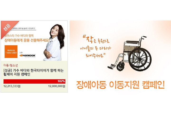 우리재단은 2014년 5월 7일부터 31일까지 글로벌기업 ‘한국타이어’와 소셜펀딩 기업인 ‘위제너레이션’, 가수 ‘바다’와 함께 장애아동을 위한 휠체어 지원 캠페인을 진행하였습니다.