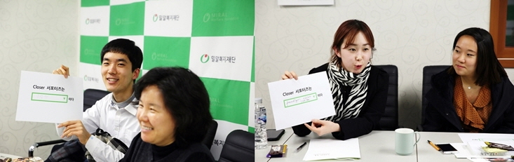 2013년 11월부터 활동을 시작한 영문번역 서포터즈 3명과 올해부터 활동을 시작한 장애체험 서포터즈 5명은 1기 Closer 서포터즈로서 이웃들에게 가까이 다가가는 일에 앞장서겠다고 다짐했습니다. 발대식에서 김찬걸 서포터즈는 “그림자와 같이 활동하겠다. 눈에 띄지는 않지만, 옆에 늘 존재하는 그림자와 같은 Closer 서포터즈가 되겠다.”고 말했고, 임정균 서포터즈는 “Paradigm Shift! 서포터즈 활동을 통해 사고가 전환되는 변화의 시점을 갖겠다.”고 소감을 밝혔습니다.