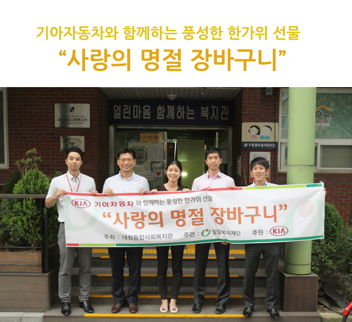 9월 12일(목), 밀알복지재단 대청종합사회복지관에서는 훈훈한 행사가 열렸습니다. 기아자동차 수출기획팀 임직원들이 홀로 사는 어르신들에게 풍성한 한가위를 선물하고자 ‘사랑의 명절 장바구니’프로그램에 참여하였습니다.