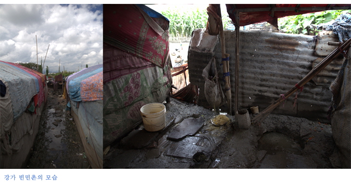쓰레기와 가축오물로 오염된 빈민촌에 약 30가구 정도가 살고 있었습니다. 돼지 돈사 근처에 천 지붕과 임시텐트로 집을 세워 생활하는 빈민촌 주민들은 오염된 물로 먹고 씻고 생활하고 있었습니다. 또한 집안 바닥도 진흙과 오물로 뒤덮여 있어 파리 떼로 가득한 상황이었습니다.