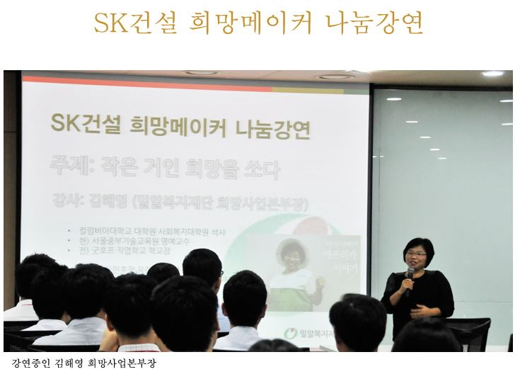 지난 7월 25일(목), 밀알복지재단은 서울 을지로 SK건설 사옥에서 SK건설 조기행 사장을 비롯한 임직원 200여명을 대상으로 희망나눔강연을 진행했다. 이 날 밀알복지재단은 SK건설을 통해 교통비 및 생계비를 지원하고 있는 105명의 아동·청소년과 매월 1명의 장애아동 수술비 지원결과 보고를 하는 시간을 가졌다. 또한 희망사업본부 김해영 본부장이 고난이 주었던 삶의 기쁨과 행복에 대한 희망찬 강연을 진행하였다.