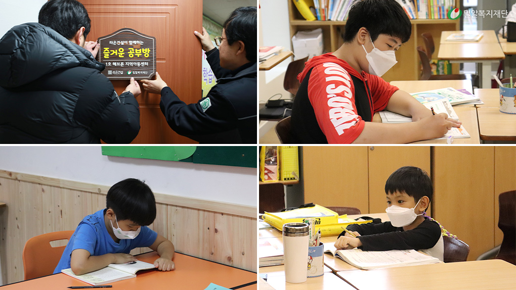 밀알복지재단은 라온건설과 함께 저소득 아동·청소년들을 위한 ‘라온 즐거운 공부방’을 개소했습니다. 코로나19로 인해 실내에서 생활하는 시간이 늘어난 아이들을 위해 지역사회의 낙후된 지역아동센터 내 공부방을 새롭게 개소하여 쾌적하고 안정적인 환경을 만들었습니다. 지난 2017년 겨울, 남양주에 있는 ‘헤브론 지역아동센터’에서 라온 즐거운 공부방 1호점 개소를 시작으로 현재까지 7호점을 개소했습니다. 아이들은 새로운 공부방에서 각종 독서, 취미 활동 등을 진행하며 조금씩 꿈을 키워나갈 수 있게 되었습니다.