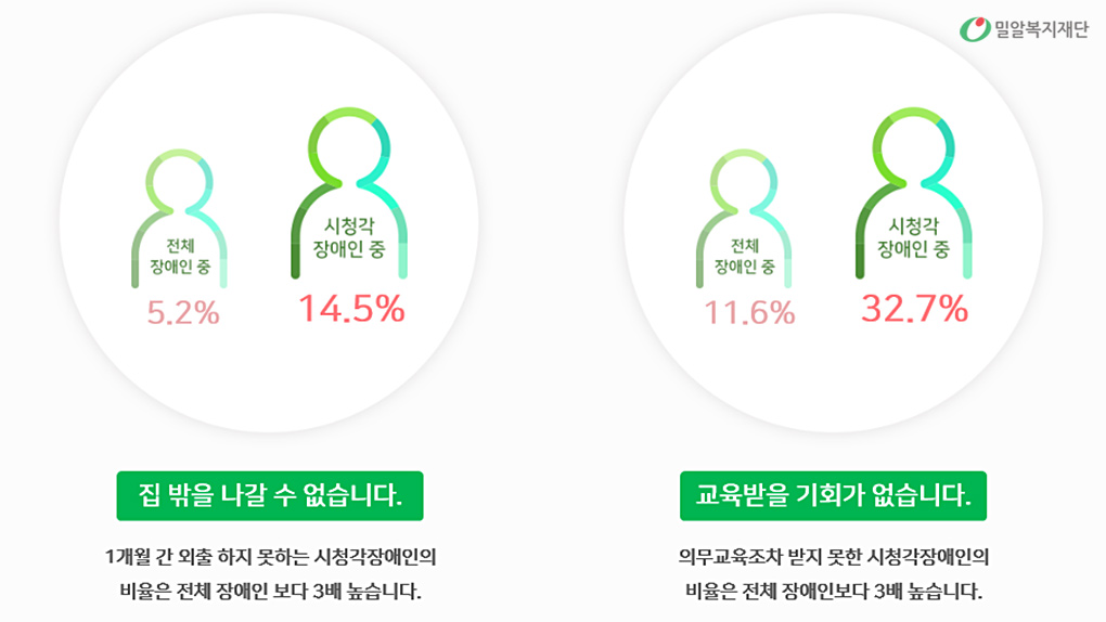 현재 우리나라는 시각과 청각 장애를 중복으로 갖고 있는 시청각장애에 대한 지원과 활동이 매우 미비합니다. 법으로 규정한 총 15개의 장애유형 중 어디에도 속하지 않기 때문인데요. 이를 위해 밀알복지재단은 ‘시청각장애인 지원센터’인 ‘헬렌켈러센터’를 2019년 개소했습니다. 헬렌켈러센터는 시청각장애인을 위한 법률제정, 인식개선 캠페인, 그리고 시청각장애인을 위한 다양한 교육(인지치료, 리더십 강화 훈련 등)을 펼치고 있습니다.