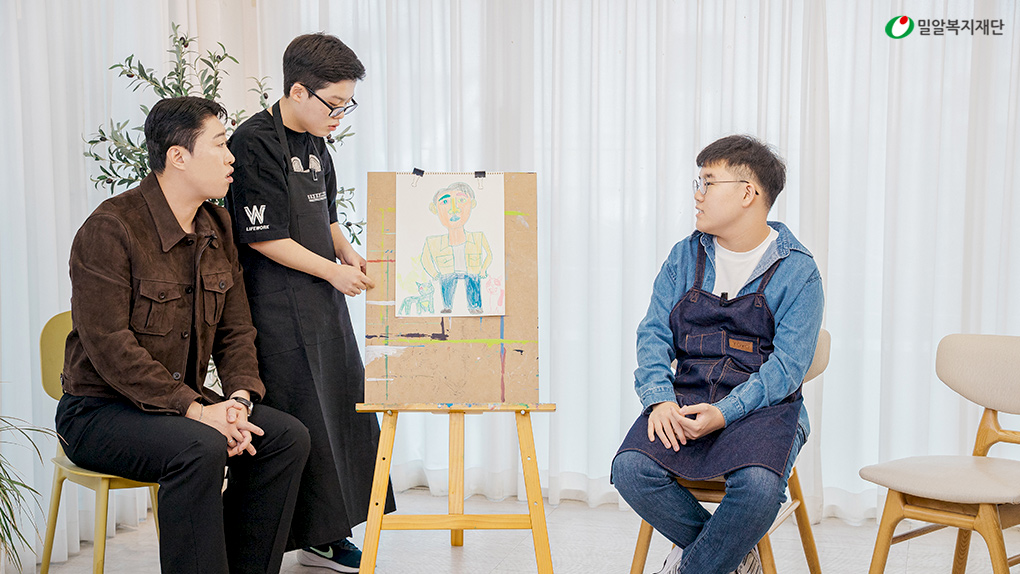 ‘고양이 춘봉·첨지·칠복 아빠’로 알려진 스탠드업 코미디언 송하빈은 150만 명이 넘는 구독자를 보유한 인기 크리에이터입니다. 일상의 소소한 이야기를 위트 있게 풀어내며 많은 사랑을 받고 있는 송하빈이, 이번에는 발달장애 청소년 예술가들의 작품 속 모델이 되어 주었는데요. 이날 현장에서는 봄 프로젝트 작가 2명([최재용·양예준])과 미대생 2명([김주희·김한별])이 한 명의 인물을 각자의 시선으로 표현하는 초상화 그리기 촬영이 진행되었습니다.
