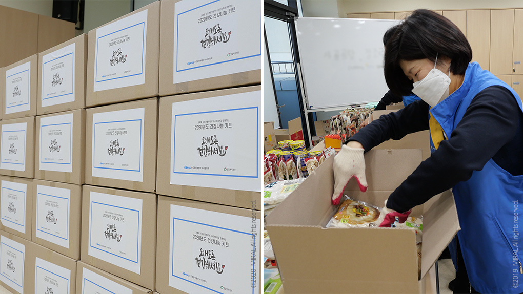 코레일 수도권동부본부 수서관리역 임직원은 저소득 장애인 및 취약계층을 위해 ‘코로나 예방 선물상자’ 만들기 봉사활동을 진행했습니다. '코로나 예방 선물상자'에는 바이러스 감염에 더욱 취약한 소외계층의 면역력 강화를 위한 홍삼 등 건강식품과 마스크, 식료품 등이 담겼습니다.