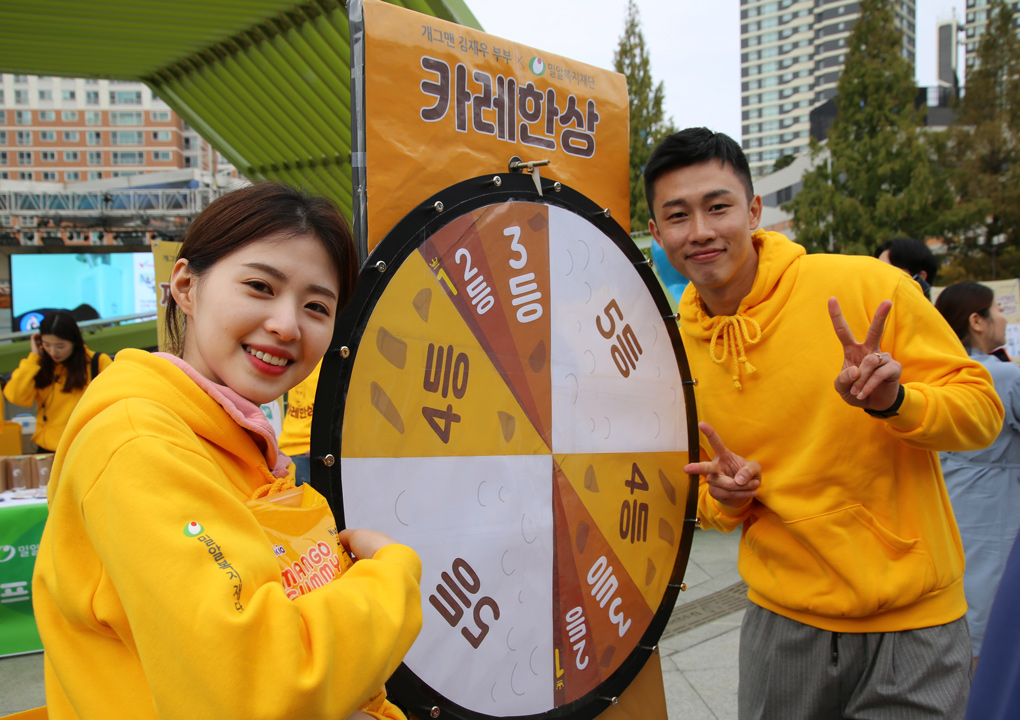 카레한상에서는 카레 뿐만 아니라 다양한 이벤트가 준비되었는데요. 먼저 카레를 받기 위해 줄을 서있는 동안 지루하지 않게끔 돌림판 이벤트가 진행되었습니다. 1등을 뽑으신 분께는 카레한상을 상징하는 노란 후드티가 제공되었고, 2등에게는 '인도카레'가 제공되었으며 그 외에도 워터젤리, 코팩, 간식 등 다양한 선물이 증정되었습니다.