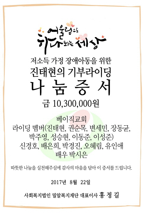 “저소득가정 장애아동들은 경제적 어려움으로 꼭 받아야 하는 치료나 수술마저 중단하는 경우가 많습니다. 도움이 시급한 저소득가정 장애아동들을 지원해주신 진태현 홍보대사와 베이직교회, 그리고 기부라이딩 참여자 분들께 감사드립니다.”