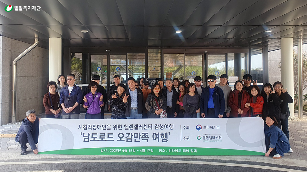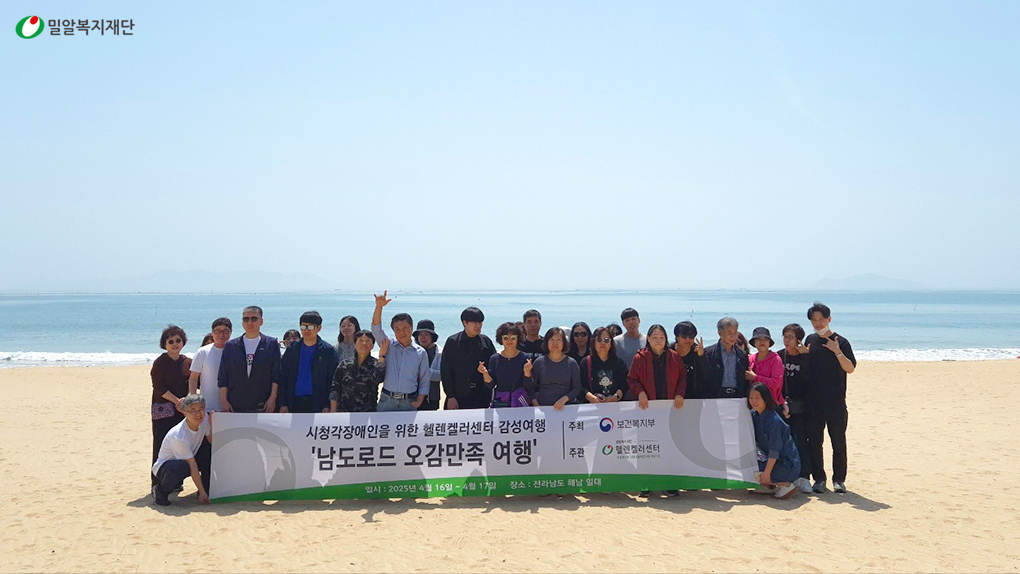 이에 밀알복지재단 헬렌켈러센터는 지난 4월 16일부터 17일까지 시청각장애인 12명과 함께 1박 2일 간 전라남도 일대를 여행했습니다. 이번 여행은 그동안 시청각장애인들이 쉽게 경험하기 어려웠던 ‘오감 만족’을 주제로, 공원과 해수욕장 등을 방문하며 다양한 교감 활동을 통해 특별한 추억을 나누는 시간이었습니다.