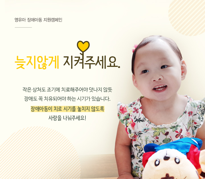 영유아 장애아동 지원캠페인 <늦지않게 지켜주세요>를 통해 여러분의 사랑으로 아이와 부모를 지켜주세요.