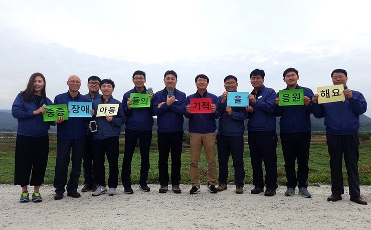 → 한라그룹 ㈜만도 원주 사업본부 직원들이 섬강 제방길 걷기 후 장애아동들을 위한 응원메세지를 보내고 있다.