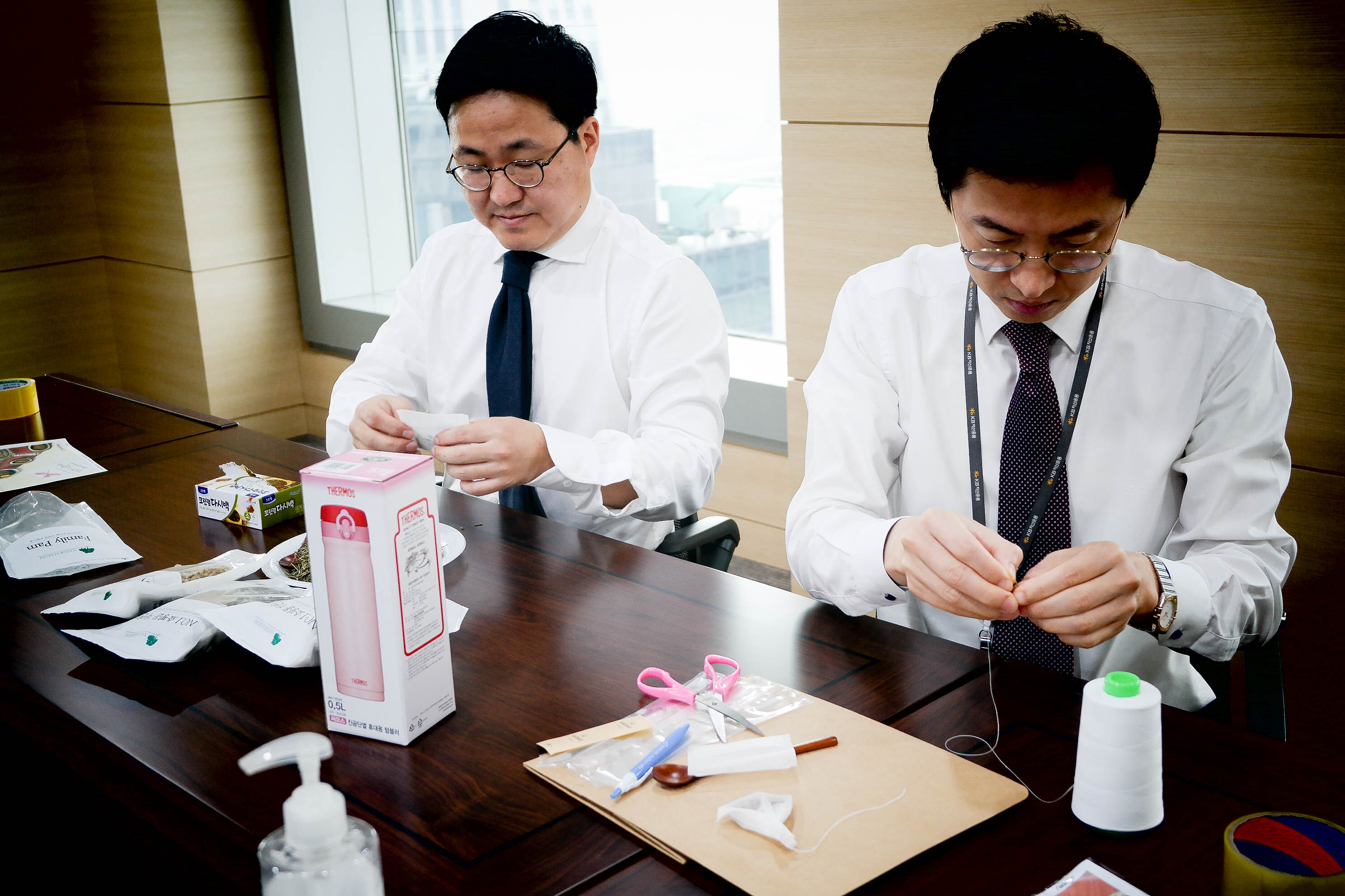 맞습니다. KB자산운용 임직원들은 손수 한 땀, 한 땀 티백을 만드는 정성을 선보였습니다.