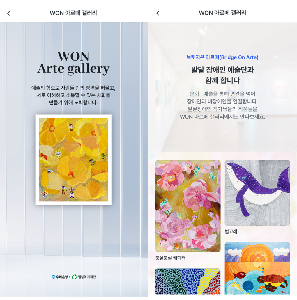 지난해 7월 선보인 WON 아르떼 갤러리는 우리은행 고객을 비롯한 많은 사람들로부터 뜨거운 호응을 얻었습니다. 금융 플랫폼을 넘어, 장애 예술인들의 문화·예술세계를 소개했다는 점에서 의미 있는 시도로 평가받았는데요. 우리은행 관계자는 “장애인도 우리가 함께 살아가는 사회공동체 속에서 충분히 주역이 될 수 있다”며, 올해에도 더 많은 발달장애인 작가들의 작품을 갤러리를 통해 소개하고 있다고 전했습니다.