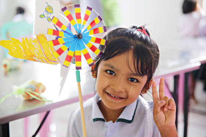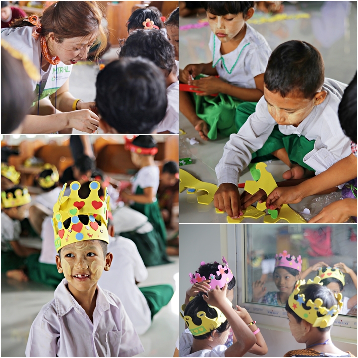 어릴 적부터 미술과 태권도, 피아노 등 예·체능 수업이 일상적인 우리나라와는 달리, 미얀마는 사립학교 외엔 예·체능 수업을 받기 어렵습니다. 그런 아이들을 위해 회원님들이 준비한 활동은 색종이와 비누클레이를 활용한 만들기 수업과 팽이치기, 림보 게임 등의 체육 활동들. 쑥스러움도 잠시, 회원님들은 동심으로 돌아간 것처럼 몸을 힘껏 날려 바람 속에 비행기를 날려보기도 하고, 아이들과 함께 ‘곰 세 마리’의 율동을 따라 하기도 합니다. 아이들은 그런 선생님들의 모습이 즐거운 걸까요? 아니면 색종이로 만든 새로운 장난감이 생긴 것이 기쁜 걸까요? 수업이 진행되는 체육관 내에는 아이들의 웃음소리가 끊이지 않았습니다. 너무나도 즐거워하는 아이들 모습에, 아이들에게 행복한 추억 하나를 선물해 준 것 같아 회원님들의 마음도 뿌듯해집니다.