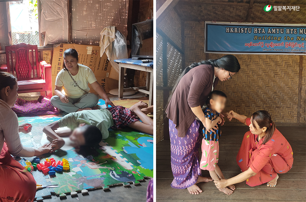 밀알복지재단은 이처럼 난민중에서도 더욱 힘겨운 삶을 살고 있는 미얀마 카친주 장애인 난민들을 위해 지원사업을 실시하고 있습니다. 장애인 자조모임을 통해 장애인 당사자와 보호자들이 심리적·사회적 지지기반을 마련할 수 있도록 돕고, 소득증대를 위한 기술 훈련 등을 제공하여 장애인들이 자립할 수 있도록 지원하고 있습니다. 또한 장애아동 부모 등 보호자들을 대상으로는 장애유형에 따른 돌봄 방법에 대해 교육하여 장애아동을 건강하게 양육할 수 있도록 돕고 있습니다.